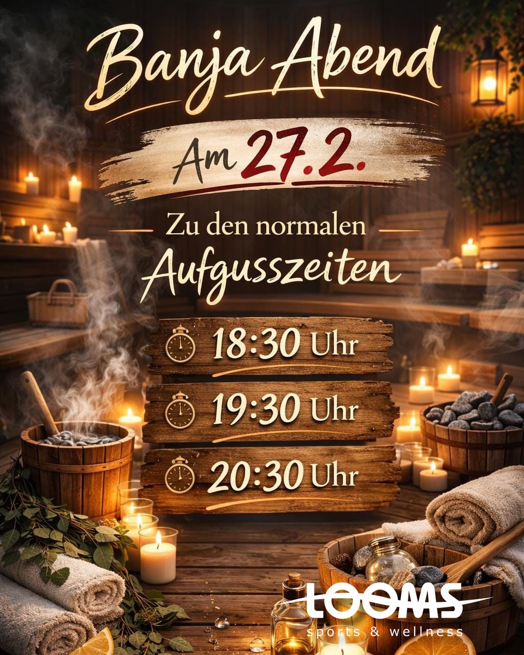 Am 27.02. findet ein Banja-Abend in der Sauna statt! Bei jedem Sauna-Aufguss werdet ihr mit einem Bündel eingeweichter Birkenzweige abgeschlagen, was angenehm erfrischend wirkt und positive Effekte auf Eure Muskulatur und die Durchblutung hat.