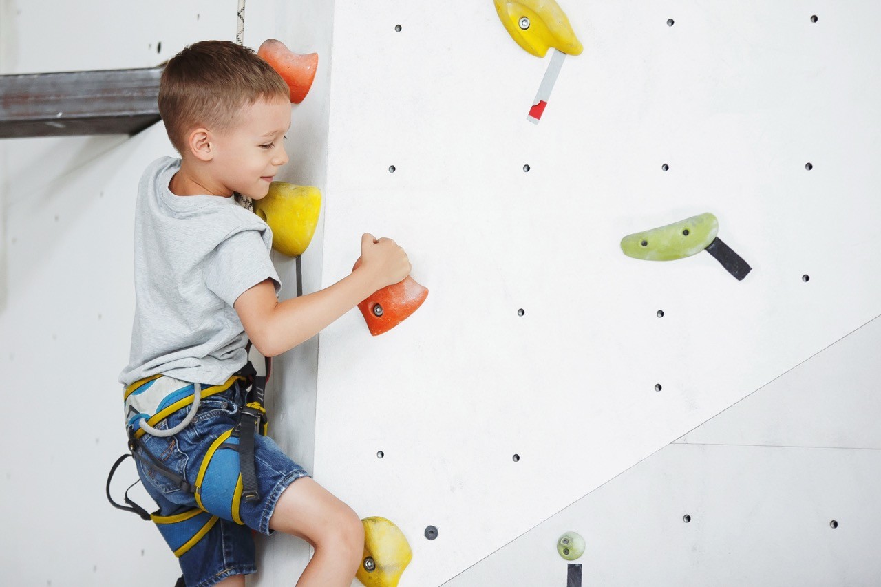 Eine kindgerechte Kletterwand und weiche Matten fördern Mut, Kraft und Abenteuerlust.